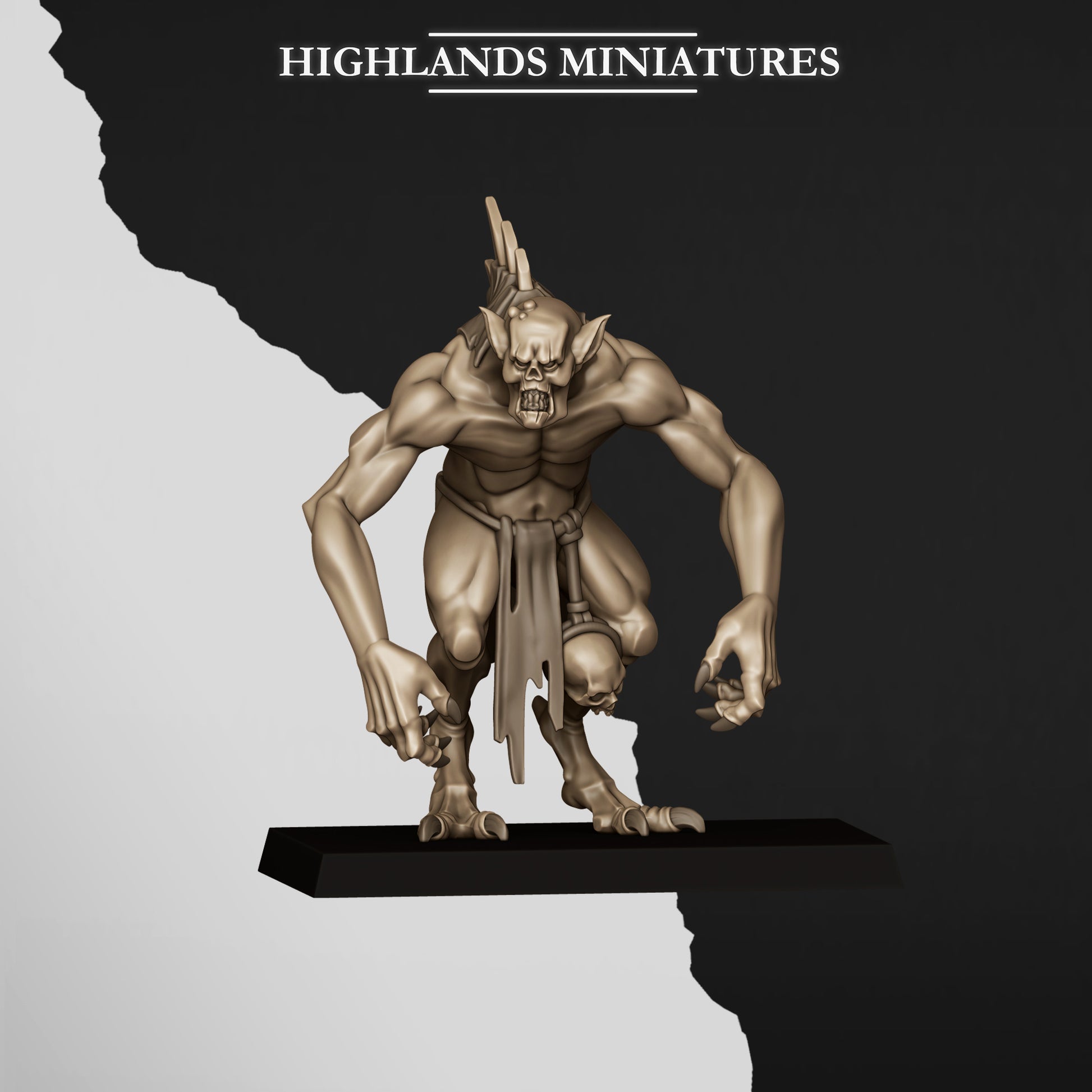 Los Ghouls Gigantes son la infantería monstruosa del ejército, una fuerza táctica cuya presencia se traduce en terror inmediato y ruptura por fuerza bruta. Su tamaño y ferocidad incontrolable les otorgan la función de ariete biológico, capaces de desmoronar formaciones pesadas y anular la resistencia con garras y colmillos. Representan la potencia desatada de la no-muerte, siendo el factor de impacto más brutal y la garantía de una aniquilación masiva.