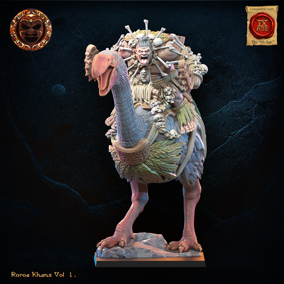 El Roroa Ariki sobre Dromornis representa la unión perfecta entre la nobleza guerrera y la fauna más imponente de las tierras ancestrales. Montado sobre el legendario Dromornis, un ave de proporciones colosales y fuerza devastadora, el Roroa Ariki dirige la carga desde una posición de dominio absoluto. Esta unidad no solo actúa como una plataforma de combate móvil capaz de romper las líneas enemigas por puro impacto, sino que sirve como un faro de autoridad que inspira a sus aliados mientras el atronador paso de su montura sacude los cimientos del campo de batalla.